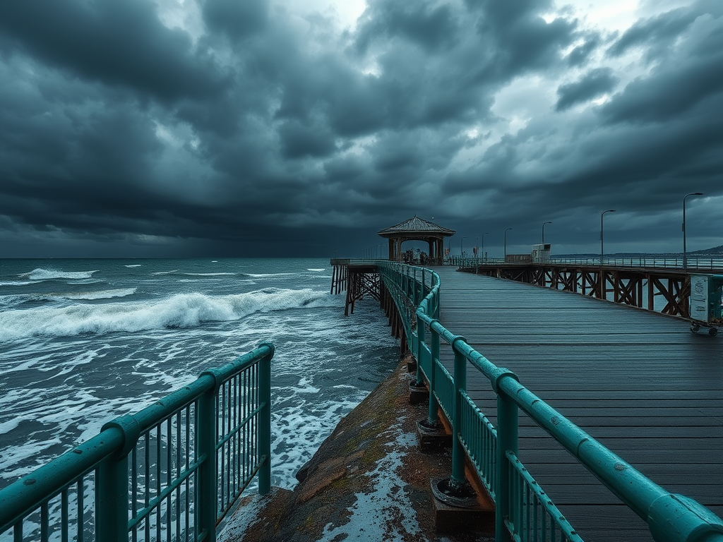 The turquoise blues of the sparkling sea are now stormy and grey, the sky is leaden. The fair is gone, and the happy people have been painted out of existence. The only figure is a solitary bent old man standing by the railing at the end of the pier.